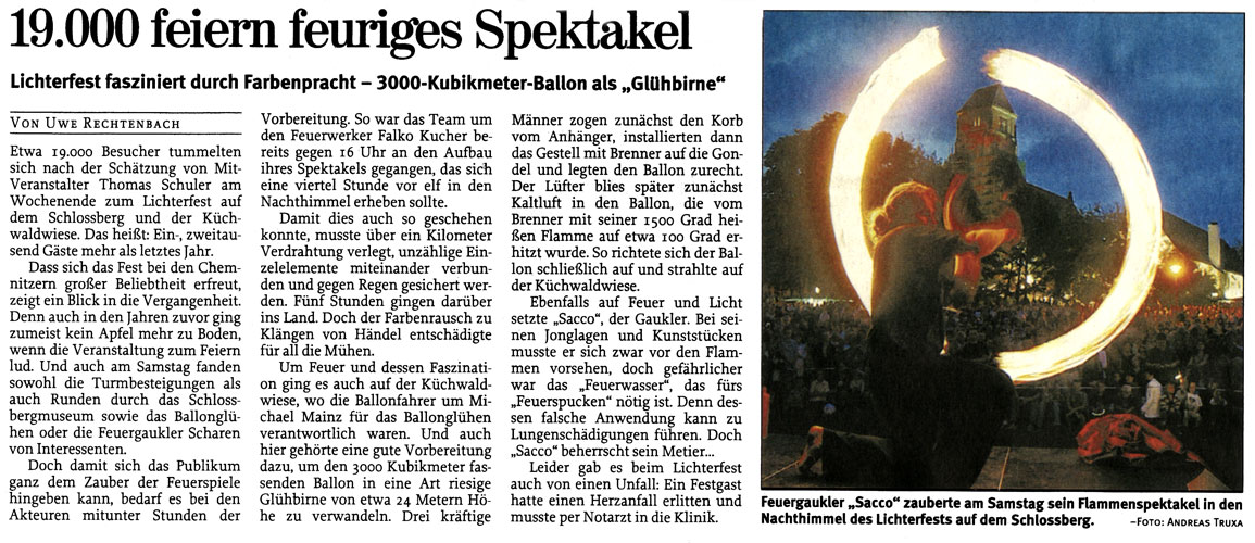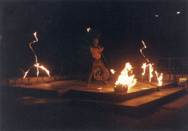 In der 7 min Feuershow zeige ich das Feuer von seiner geheimnisvollen und verführerischen Seite mit Develstik und Fackeln, wo auch die klassischen Fakirelemente wie Feuerspucken- und -schlucken vorkommen.