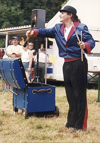 Mit einem Koffer oder mit einer rollenden Truhe kann ich an jedem Platz, auf Straßen und Bühnen eine Gauklershow spielen.