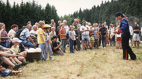 Als umherziehender Gaukler erzähle ich mit meinen Jongliergeräten (Develstik, Keulen, Bälle, Diabolo) beziehungsweise mit fliegenden Alltagsgegenständen (Regenschirm, Klostopfer oder Besen ) meine Geschichten für Groß und Klein. Wobei das Publikum nicht nur Zuschauer ist.
