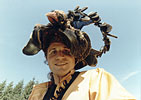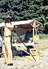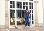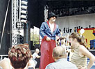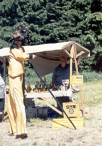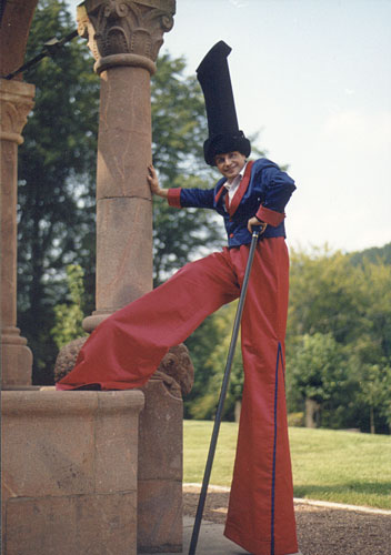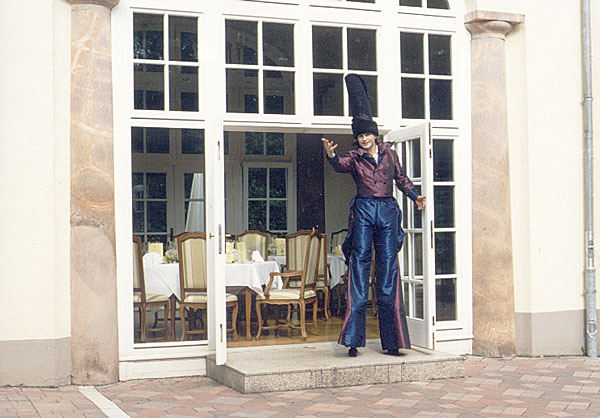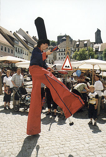 Ein Fotograf auf Stelzen. Mit einem nostalgischen Fotoapparat kann er sogar Polaroidfotos machen.